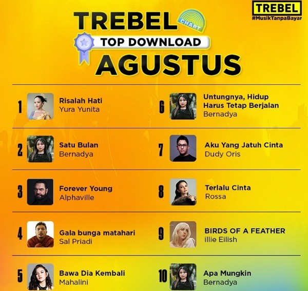 JAKARTA, vozpublica.id - Aplikasi TREBEL Music baru saja merilis hasil top download di mana berisi 10 lagu yang paling banyak didownload dan didengarkan tanpa bayar selamanya selama bulan Agustus 2024. Lagu yang menjadi tren “gak bisa Yura” di TikTok yaitu Risalah Hati yang dinyanyikan ulang Yura Yunita menjadi jawara di peringkat #1.