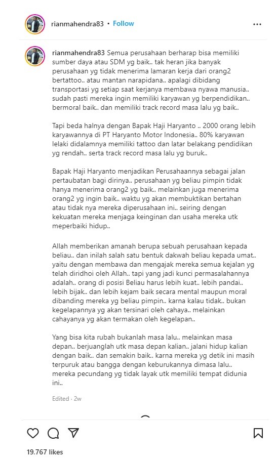 "Tapi beda halnya dengan Bapak Haji Haryanto .. 2.000 orang lebih karyawannya di PT Haryanto Motor Indonesia.. 80% karyawan lelaki di dalamnya memiliki tattoo dan latar belakang pendidikan yg rendah.. serta track record masa lalu yg buruk..," kata Rian Mahendra.