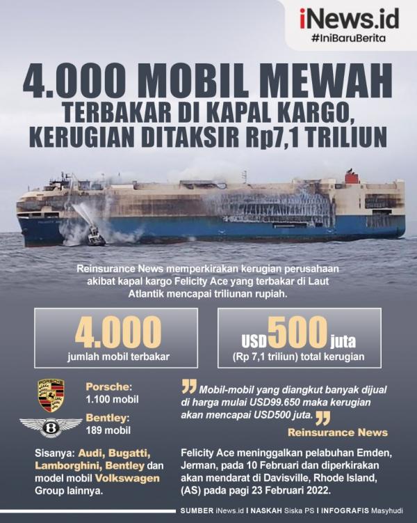 JAKARTA, vozpublica.id - Upadate terbaru kapal kargo, Felicity Ace yang terbakar di Laut Atlantik, Reinsurance News memperkirakan kerugian perusahaan mencapai USD500 juta atau setara Rp7,1 triliun. Ini mengingat total ada sekitar unit 4.000 unit mobil mewah terbakar, antara lain Porsche, Audi, Bugatti, Lamborghini, Bentley dan model mobil Volkswagen Group lainnya.