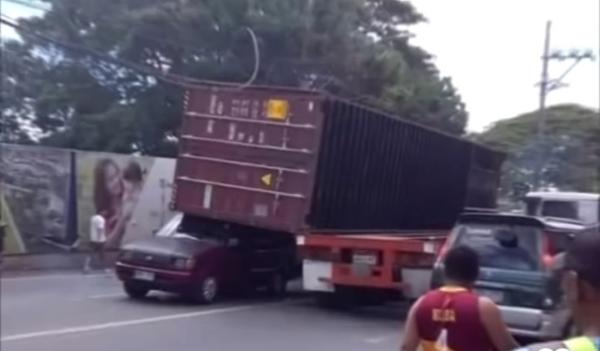 Dalam video tampak mobil berwarna merah itu tak bisa bergerak setelah tertimpa kontainer di tengah jalan. Jika dilihat sekilas mirip dengan Toyota Kijang lawas.