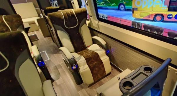 Semua kursi pada bus dilengkapi dengan personal TV, meja lipat, dan mesin pijat. Tersedia juga berbagai fasilitas, seperti AC, Toilet, Audio, Leg rest, USB Charging, snack, dan servis makan.
