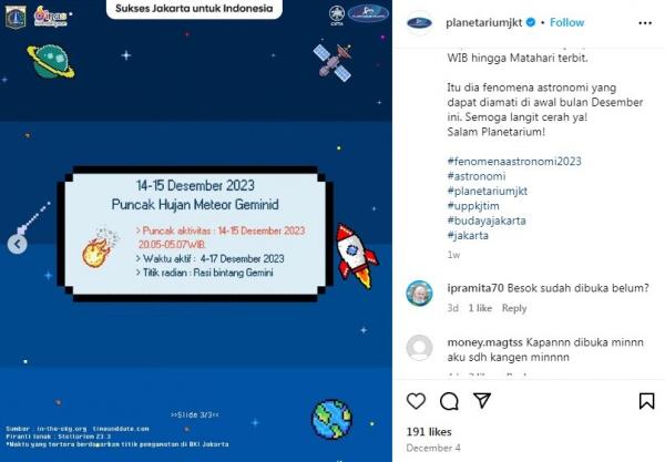 Sebagaimana dikutip dari akun media sosial Planetarium Jakarta, hujan meteor Geminid bisa dilihat mulai pukul 20.05 WIB hingga 05.07 WIB saat Matahari terbit.