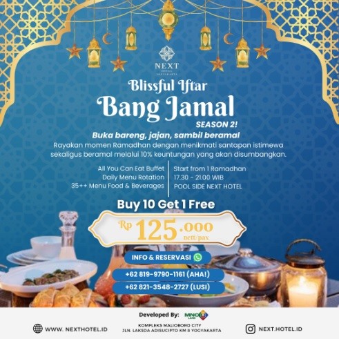 Terbayangkan serunya seperti apa bukber di Next Hotel Yogyakarta? Bisa menyantap hidangan lezat dari hotel berbintang, makannya all you can eat, ada live akustiknya, dan dapat kesempatan meraih doorprize voucher menginap di Next Hotel Yogyakarta.