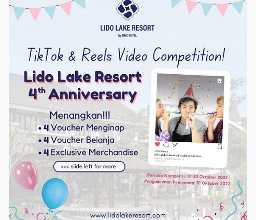 Karena itu, ayo ikuti Kompetisi TikTok & Reels Video dengan total hadiah senilai jutaan rupiah. “Kalian bisa mengikuti TikTok & Reels Video Competition dengan total hadiah senilai jutaan rupiah. Jika kalian beruntung bisa mendapatkan voucher staycation di Lido Lake Resort," ujar Dadi Mulyadi beberapa waktu lalu.