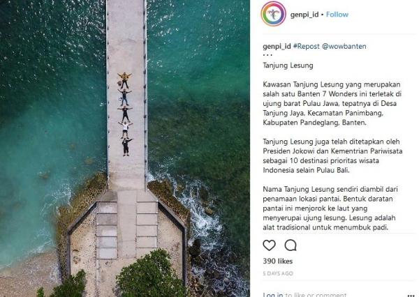 "Kawasan Tanjung Lesung merupakan salah satu Banten 7 Wonders yang terletak di ujung barat Pulau Jawa, tepatnya di Desa Tanjung Jaya, Kecamatan Panimbang, Kabupaten Pandeglang, Banten. Tanjung Lesung telah ditetapkan oleh Presiden Jokowi dan Kementerian Pariwisata sebagai 10 destinasi prioritas wisata Indonesia selain Pulau Bali," tulis Instagram Genpi_id, Rabu (13/6/2018).