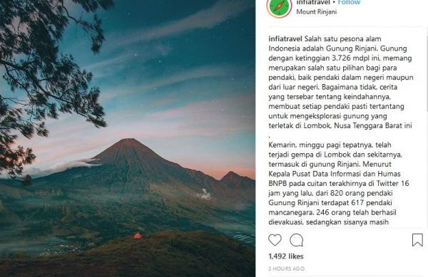 "Salah satu pesona alam Indonesia adalah Gunung Rinjani. Gunung dengan ketinggian 3.726 mdpl ini, memang merupakan salah satu pilihan bagi para pendaki, baik pendaki dalam negeri maupun dari luar negeri. Bagaimana tidak, cerita yang tersebar tentang keindahannya, membuat setiap pendaki pasti tertantang untuk mengeksplorasi gunung yang terletak di Lombok, Nusa Tenggara Barat ini. Kemarin, minggu pagi tepatnya, telah terjadi gempa di Lombok dan sekitarnya, termasuk di gunung Rinjani. Menurut Kepala Pusat Data Informasi dan Humas BNPB pada cuitan terakhirnya di Twitter 16 jam yang lalu, dari 820 orang pendaki Gunung Rinjani terdapat 617 pendaki mancanegara. 246 orang telah berhasil dievakuasi, sedangkan sisanya masih menunggu untuk dievakuasi. Mari sama-sama kita doakan teman-teman pendaki yang masih bertahan di Gunung Rinjani semoga semuanya sehat & selamat, agar dapat kembali lagi kerumah dan bertemu keluarga masing-masing #prayforlombok #prayforrinjani," tulis Instagram @infiatravel, dikutip Senin (30/7/2018).