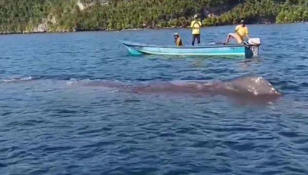 Dalam video terlihat pemilik akun membagikan momen di tengah laut. Terlihat dua orang warga sedang menaiki kapal kayu, ternyata di depan kapal kayu itu terdapat ikan paus berukuran besar.