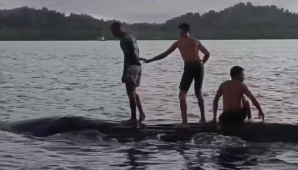 Tak hanya melihat paus, rupanya momen ini dimanfaatkan oleh anak-anak sekitar berenang dan bermain dengan ikan paus. Bahkan anak-anak itu terlihat menaiki punggung paus.