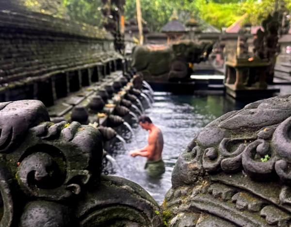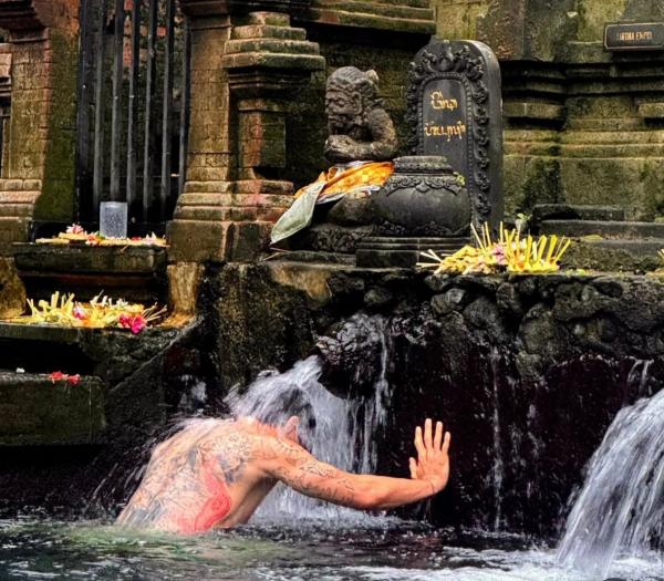 Ibrahimovic juga menikmati setiap momennya melakukat tradisi melukat di Bali. Ia terlihat membungkuk sembari membiarkan air mengalir dari bebatuan ke arahnya. Prosesi itu dilakukan dengan baik oleh Ibrahimovic.